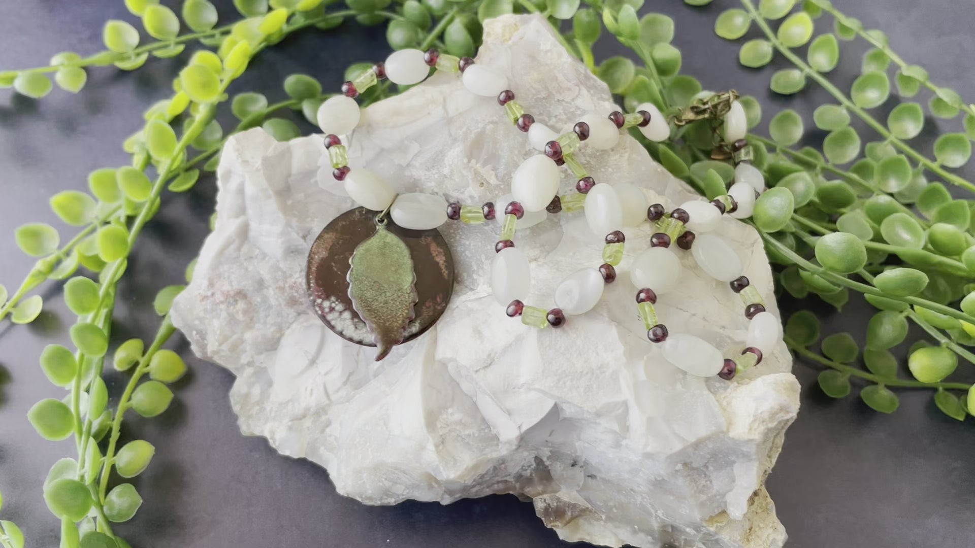 This gorgeous torch-fired enamel burgundy and white copper disc, paired with an ombre green to burnt orange leaf overlay pendant is one-of-a-kind. Strung on a beaded necklace of oval moonstones, round garnet, and rectangular peridot, you will feel one with nature and femininity.