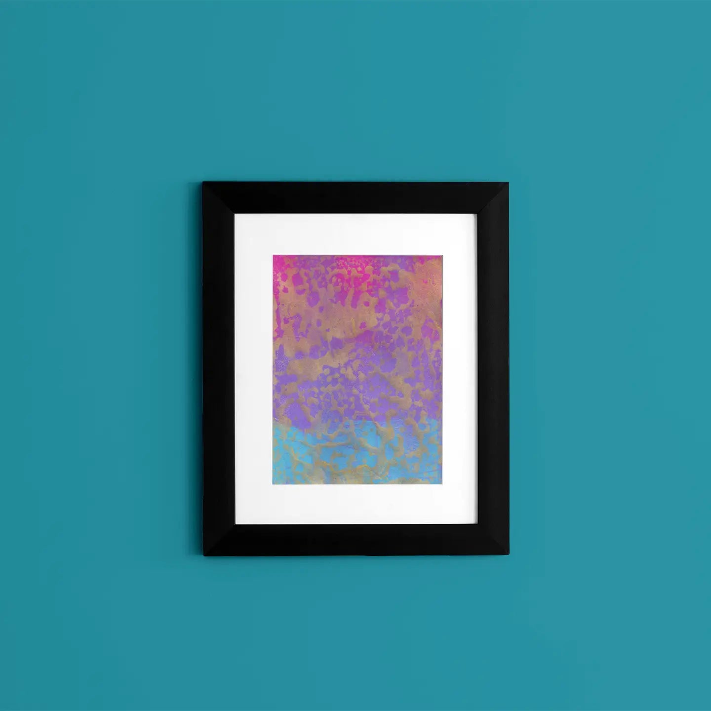 This 8x10 gel plate print is a stunning addition to any art collection, and its versatility allows you to display it in various settings. Whether you choose to frame it and hang it on your wall, display it on a shelf, or gift it to a fellow art enthusiast, the "Mystic Chromatic Symphony" is sure to evoke a sense of joy and inspiration.