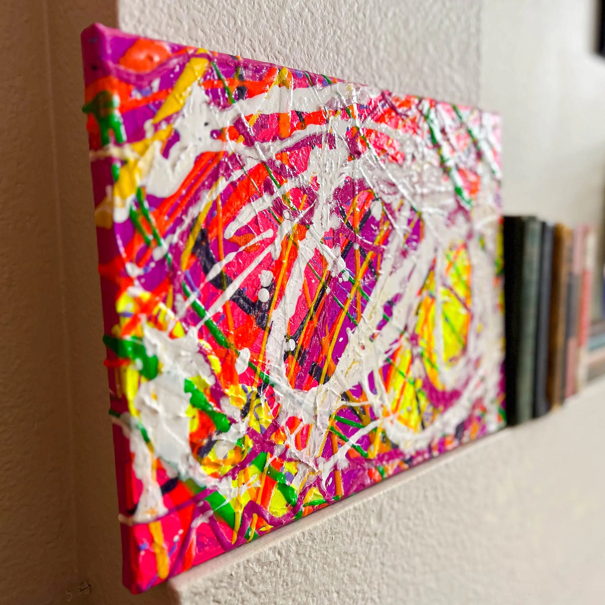 Ignite a revolution of color in your living space with "Neon Revolution," an original 11x14 abstract painting by artist, Alexandria Wagner. Bursting with neon hues of pink, purple, green, yellow, and white, this vibrant masterpiece dances with life and energy. The textured background, masterfully sculpted with modeling paste, adds an enthralling depth, allowing colors to meld in flowy patterns of bright shades and organic shapes. Wagner's adept handiwork in blending and streaking results in a piece that resonates with emotion and movement.