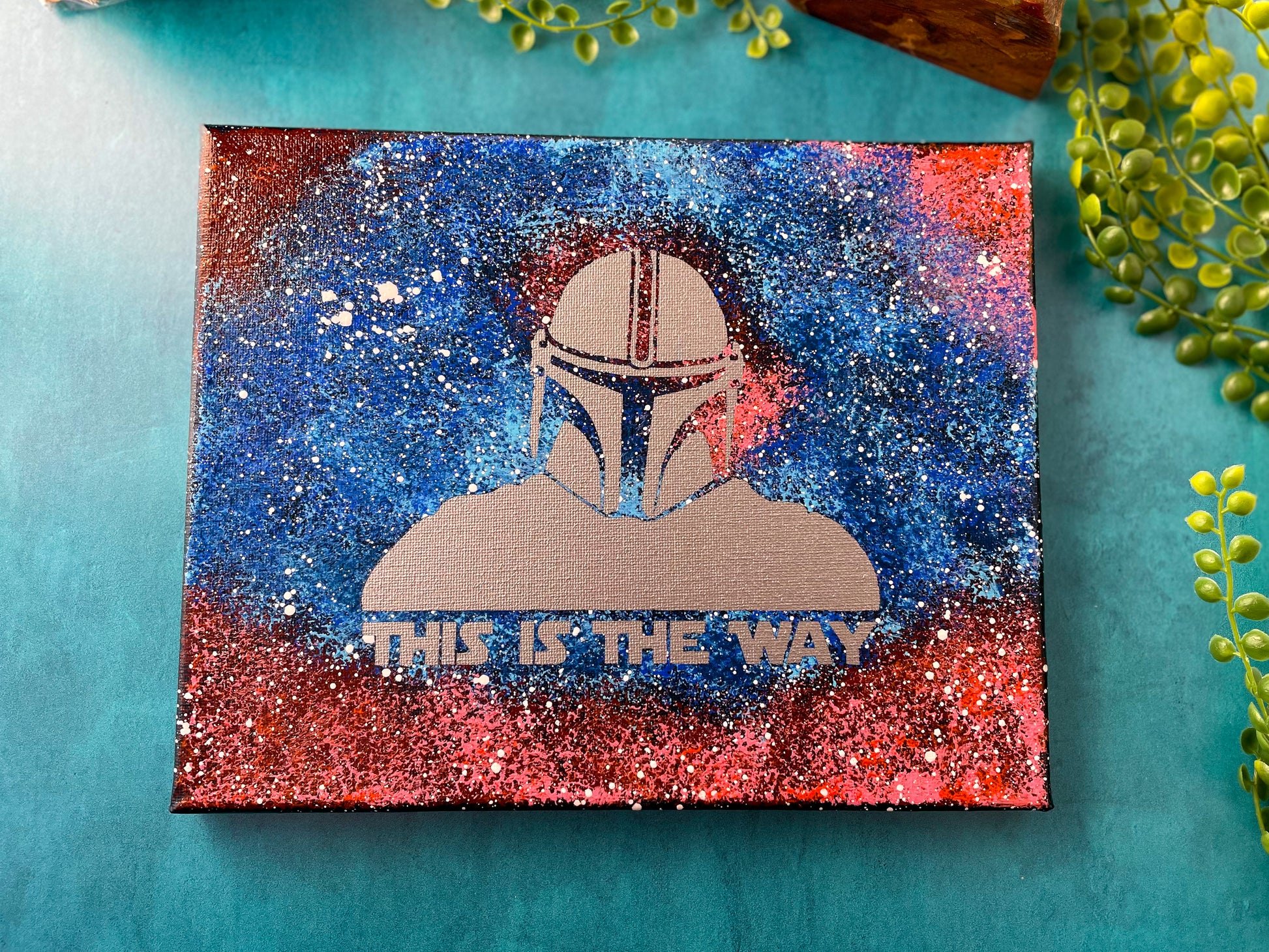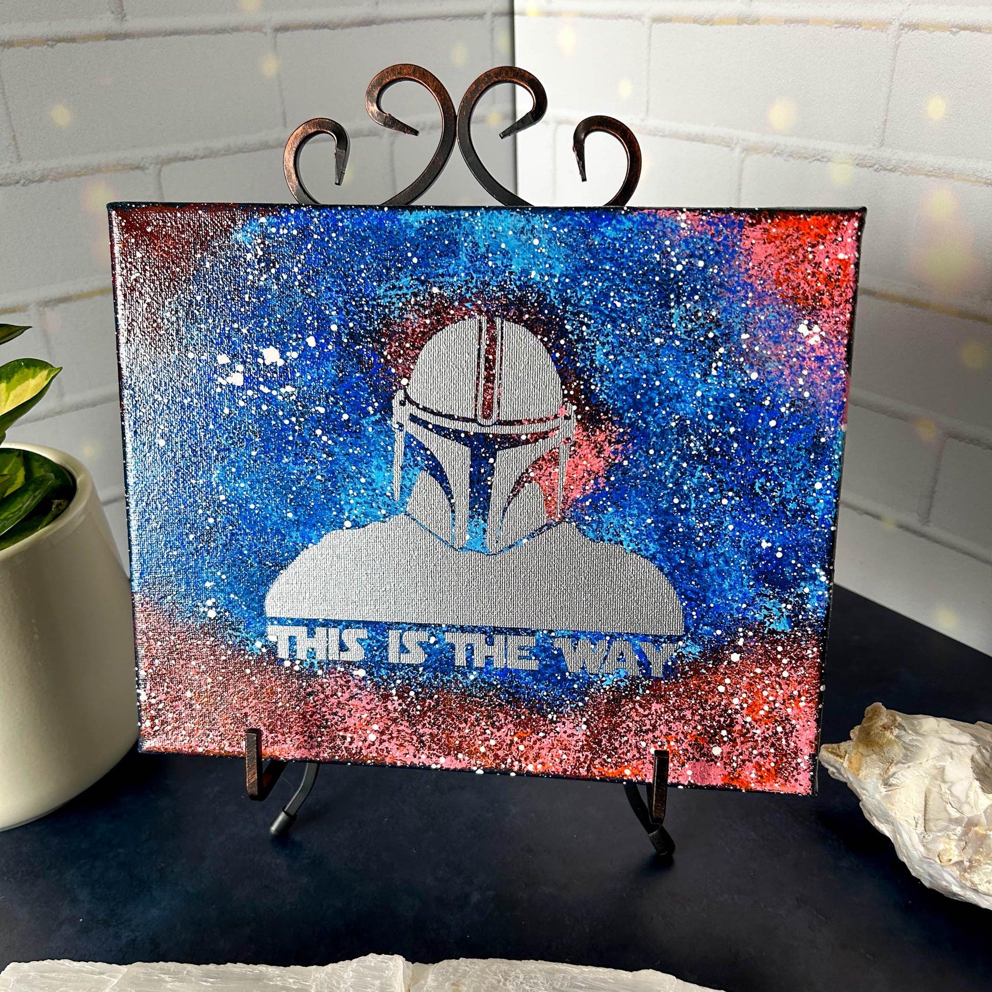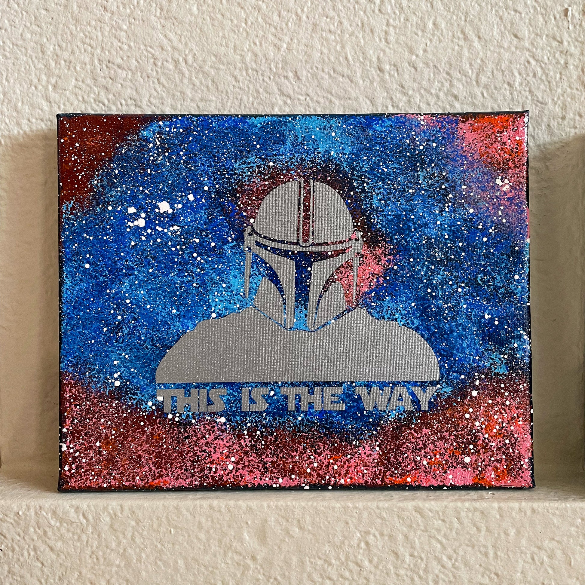 Bring the epic adventures of The Mandalorian into your home with this stunning 8x10 abstract galaxy painting. The painting is an original acrylic artwork that showcases the iconic character from the hit Disney+ series in a unique and captivating way.